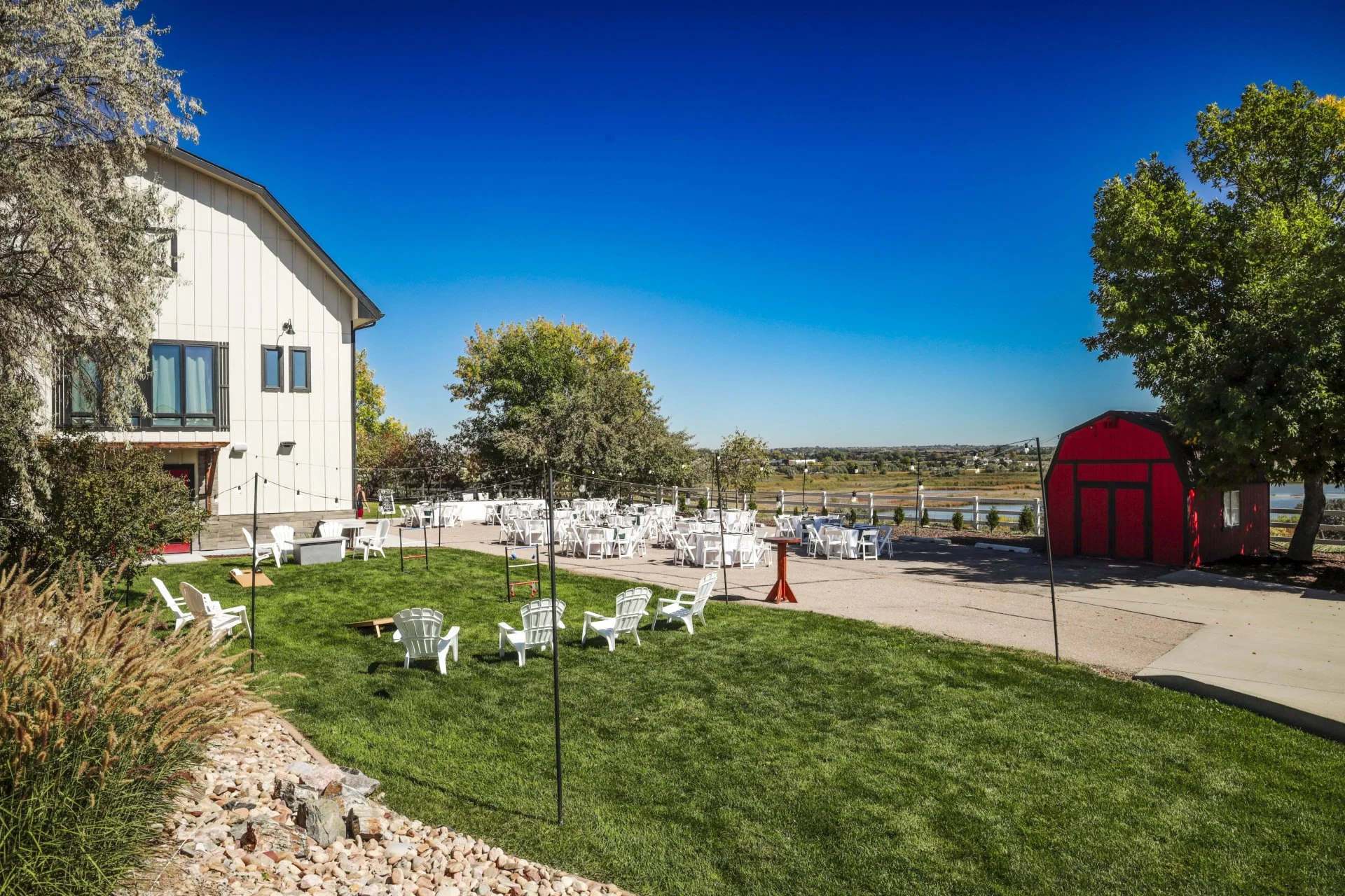 This beloved outdoor reception space seamlessly blends functionality with farmhouse elegance, accommodating your dinner tables, head or sweetheart table, and dance floor beneath twinkling market lights. Mature trees and our charming red barn create an idyllic backdrop for golden hour photos and celebrations under the stars.