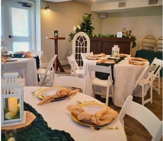 Enjoy the beauty of the outdoors from the comfort and security of this lovely indoor space. The ideal location for your cocktail hour and dinner buffet.
